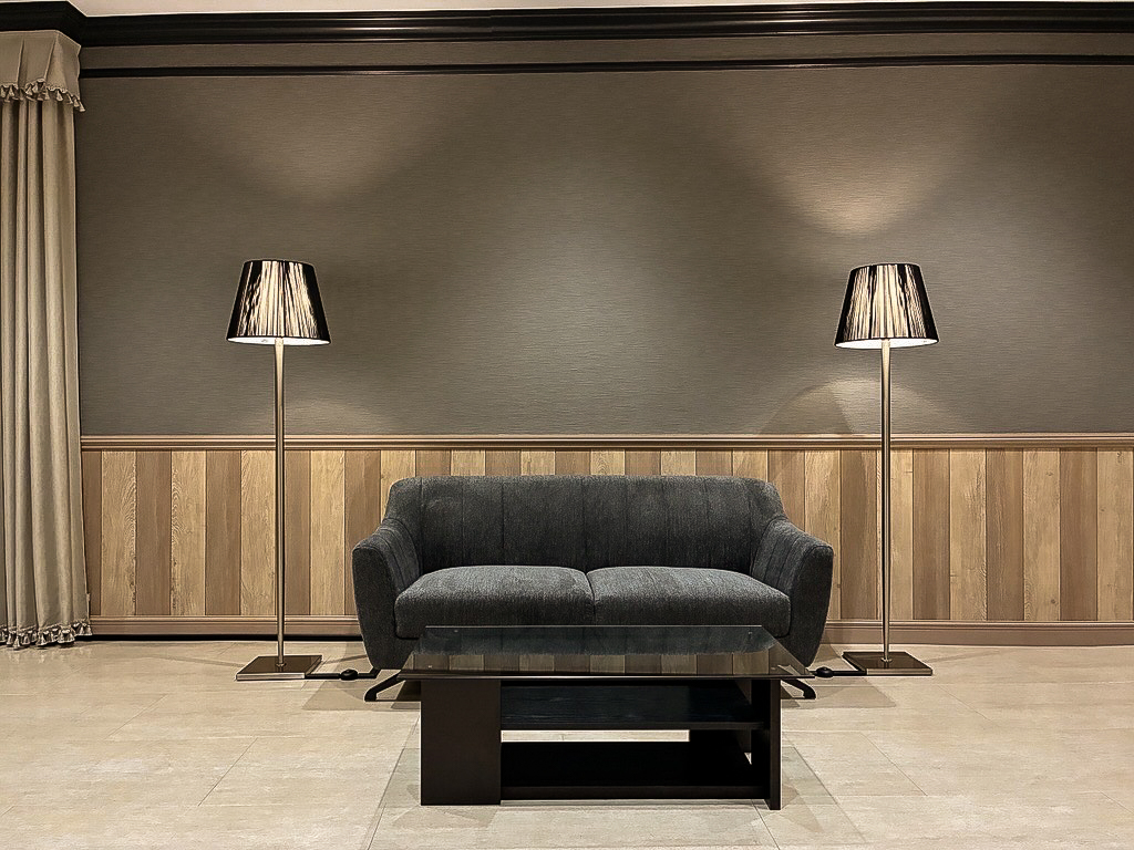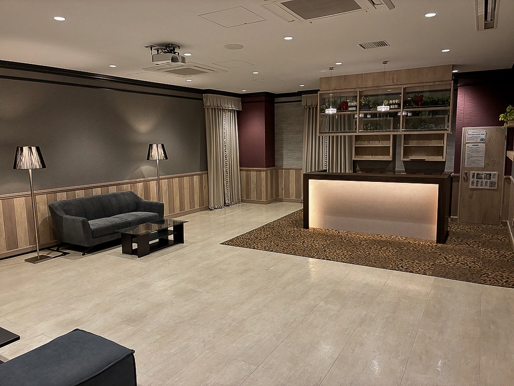 ホテルフロントの実習施設へ用途変更するにあたり、内装のリニューアルおよび家具の納品を行いました。ご予算に配慮しながら、高級ホテルのフロントをイメージした空間づくりをコンセプトに、
